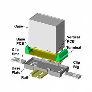 Tri-Mount Case having cover dimension 43 x 78 x 76 mm is designed to have snapped together verity of base plate that offers different types of mounting to the case. Case cover has PCB Guides for two vertical PCBs and it can also accommodate with spacer a horizontal PCB ideal for holding signaling devices / indicators and switches. One type of Base plate offers 8 pin / 11 pin socket mounting facility and other type of Base plate is designed to offer Rail / Wall mounting facility. Innovative designed pair of clips can be snapped in the holes of the Base plate at two different positions. Clips snapped in to outer hole position of base plate offers Wall mounting facility and by just changing it to inner hole position it facilitate case a rail mounting option. Case is designed for customer specific solution in Termination for rail/ wall mounting application. Case Base PCB has space on both sides for terminals. Customer can use our standard lug size terminal or can use standard commercial terminals of phoenix, weidmuller, Wago, Molex and other suppliers. The structured surface with erosion-structure gives high aesthetic look to Tri-Mount Plastic Case. Customized solutions are possible like cutouts for potentiometers, switches, LED, etc. and custom colors and special markings.