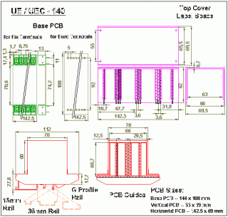 Enclosure assembly consists of 35 mm Foot pieces, Spacer piece with End pieces and Top cover. Foot piece provides fixing for complete assembly by simple snap fitting on all three rails. Enclosure has Integral molded PCB guides for Base PCB and auxiliary Vertical & Horizontal PCBs.